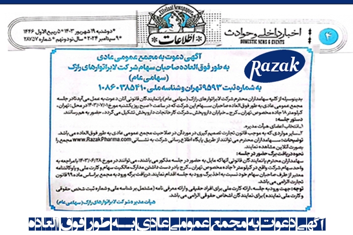 مجمع عمومی فوقالعاده صاحبان سهام شرکت لابراتوارهای رازک صبح امروز یکشنبه 1 مهرماه 1403 راس ساعت 10 برگزارشد.