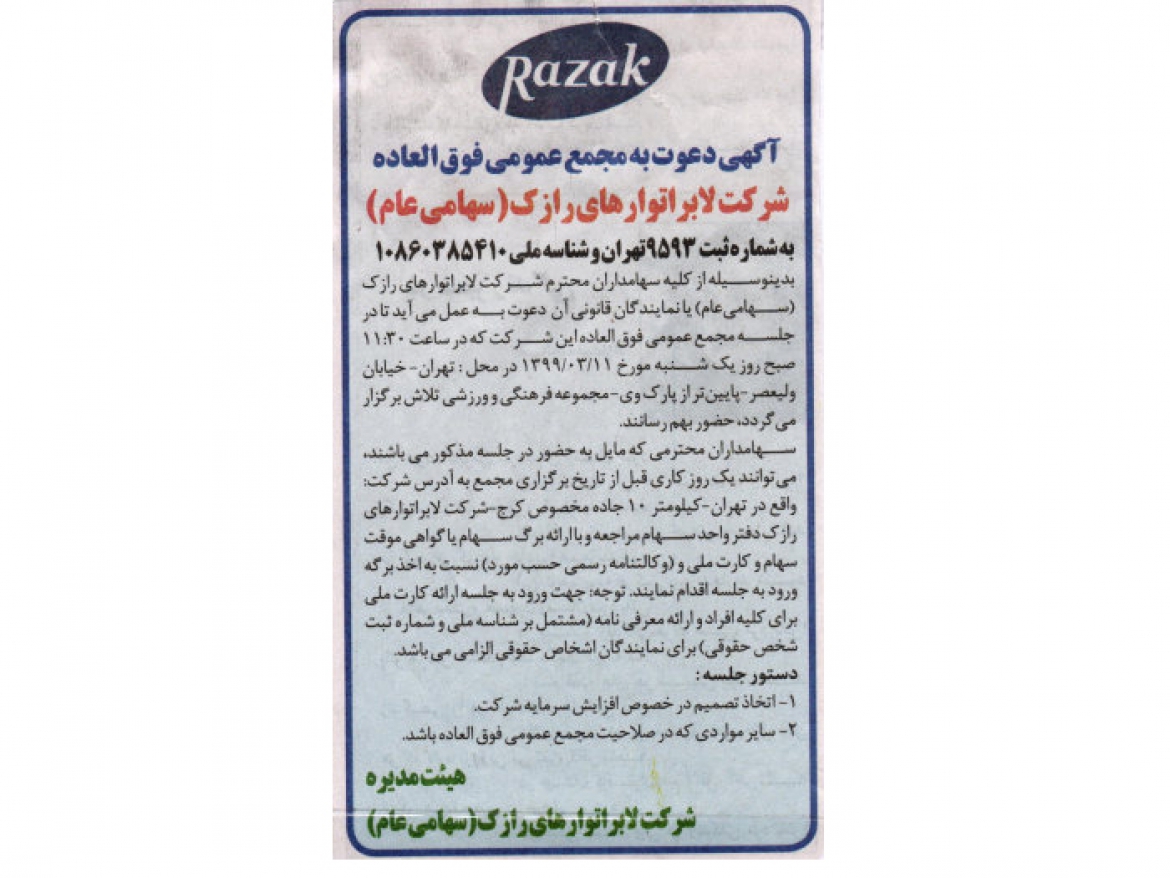 آگهی دعوت مجمع عمومی فوق العاده - RazakPharma.com