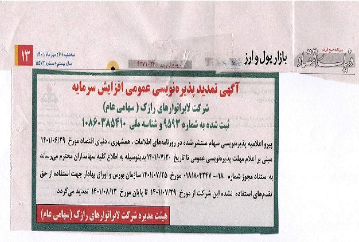 آگهی تمدید پذیره نویسی عمومی افزایش سرمایه شرکت رازک - RazakPharma.com